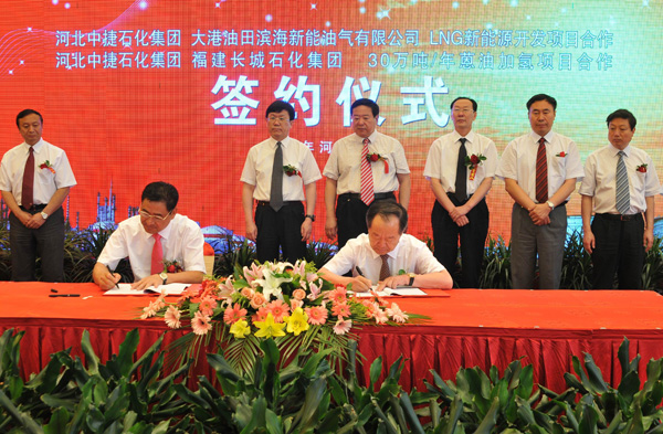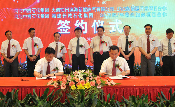 當(dāng)天簽約的兩個(gè)項(xiàng)目分別是中捷石化集團(tuán)與大港油田濱海新能油氣有限公司LNG新能源開發(fā)項(xiàng)目合作協(xié)議、中捷石化與福建長城石化集團(tuán)有限公司30萬噸/年蒽油加氫項(xiàng)目合作協(xié)議。