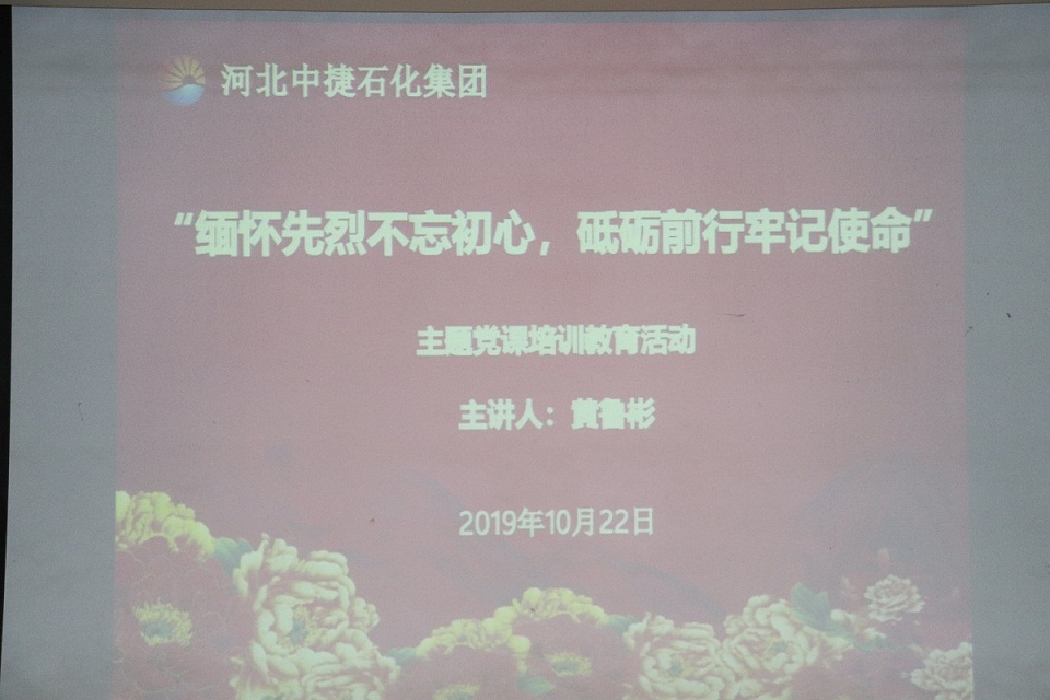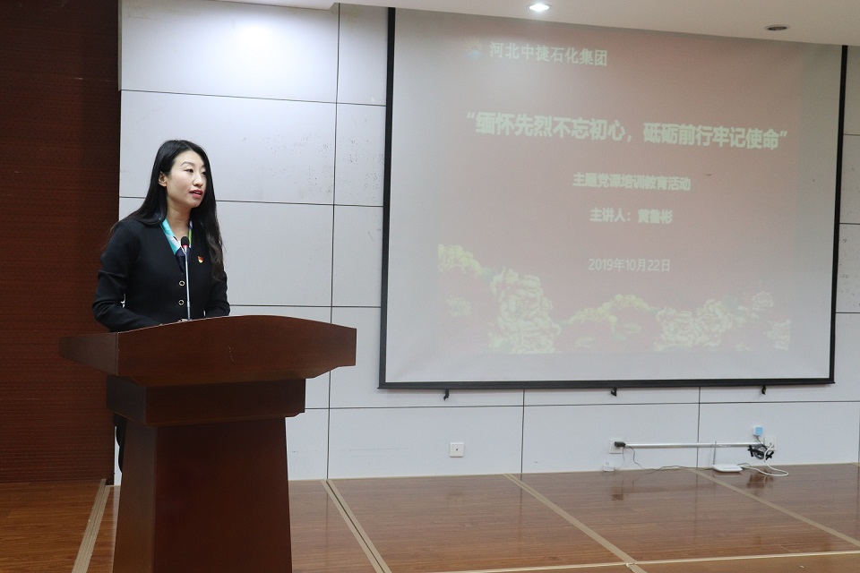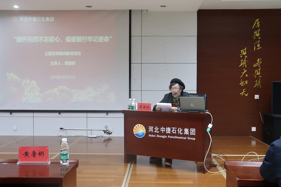 為緬懷革命先烈功績,弘揚革命傳統(tǒng)精神,激發(fā)廣大黨員干部愛國主義、集體主義精神和社會主義道德情操風尚,培育和踐行社會主義核心價值觀,增強廣大黨員干部干事創(chuàng)業(yè)的向心力和凝聚力,10月22日,集團黨委在科研樓六樓會議室組織開展2019年“緬懷先烈不忘初心,砥礪前行牢記使命” 主題黨課培訓教育活動,特邀抗戰(zhàn)英雄黃驊之女黃魯彬女士為大家授課,集團公司總經理喬樹華,黨委副書記朱振江、黨支部委員,黨建共建單位中海石油中捷石化有限公司黨員代表、集團各單位黨支部書記、工會主席、黨員代表、黨務工作者共計70余人參加活動,中捷產業(yè)園區(qū)黨群工作部孟輝部長、組宣部黨員代表出席了本次活動。