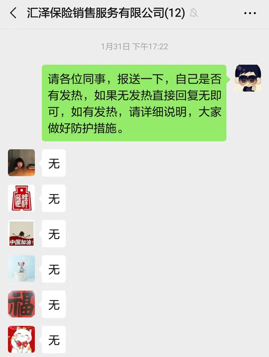 隨著防疫工作的深入,黨支部把收集單位員工信息、活動范圍、體溫檢測作為重要環(huán)節(jié)。現(xiàn)在匯澤保險銷售服務(wù)有限公司全體員工自發(fā)加入到防控隊伍中,筑起了防控疫情的鐵壁銅墻。匯澤保險黨支部在落實防疫工作的同時,在公司群和支部群中時時發(fā)送疫情期間個人居家和復(fù)工防護(hù)要點(diǎn),重點(diǎn)關(guān)注廣大員工身體健康和生命安全。