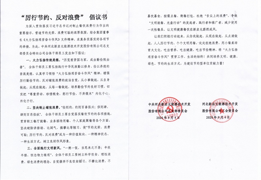 新啟元黨總支、新啟元工會(huì)組織全體職工簽訂了《厲行節(jié)約、反對(duì)浪費(fèi)》倡議書。倡議全體職工要從自身做起,從點(diǎn)滴做起,積極營(yíng)造“節(jié)約光榮、浪費(fèi)可恥”的氛圍,堅(jiān)決制止餐飲浪費(fèi)行為。