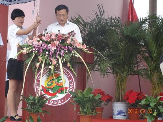 2012年9月2日上午10點(diǎn),秋雨淅瀝,彩帶飄飄。黃驊中學(xué)在眾人翹盼中,迎來(lái)了她60歲的生日慶典,來(lái)自社會(huì)各界的校友齊聚一堂。慶典會(huì)上,集團(tuán)公司總經(jīng)理于國(guó)臣代表集團(tuán)公司董事長(zhǎng)王振華,以及捐資助教的企業(yè)界同仁發(fā)言。發(fā)言中,于總既表達(dá)了中捷石化對(duì)黃驊中學(xué)的深切關(guān)注和支持,又表達(dá)了對(duì)黃驊中學(xué)60年華誕的祝福,以及對(duì)歷屆教師春風(fēng)化雨的敬意。