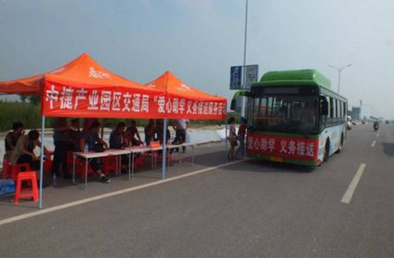 此次活動(dòng)我公司共出動(dòng)公交車2輛,出租車20輛,并且有運(yùn)政、路政共10名執(zhí)法人員參加,公交車和出租車的LED屏上顯示著醒目的“愛(ài)心助學(xué),義務(wù)接送”信息,并在黃驊汽車站設(shè)立了專門的服務(wù)臺(tái)和工作人員,引導(dǎo)遠(yuǎn)道而來(lái)的家長(zhǎng)和新生免費(fèi)乘車。工作人員幫新生提行李、引路,及時(shí)將新生和家長(zhǎng)送到早已等候的班車,然后一站式送達(dá)至學(xué)校。此次義務(wù)接送農(nóng)大新生入學(xué)活動(dòng),得到廣大新生和家長(zhǎng)們一致好評(píng)。