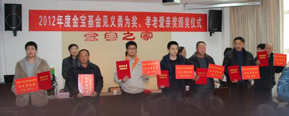 2012年12月12日下午,在金寶商城六樓培訓(xùn)室內(nèi),舉行了2012年度金寶基金見義勇為獎(jiǎng)、孝老愛親獎(jiǎng)?lì)C獎(jiǎng)儀式,表彰了跳入臭水坑中勇救落水老人的新啟元員工杜國號(hào)等7名“見義勇為先進(jìn)個(gè)人”。在大家熱烈的掌聲中,黃驊市委常委、宣傳部長程秀珍、副市長陳增強(qiáng)、金寶公司總經(jīng)理趙金義、市文明辦主任等領(lǐng)導(dǎo)將榮譽(yù)證書和2000元的獎(jiǎng)勵(lì)發(fā)到他們手中。